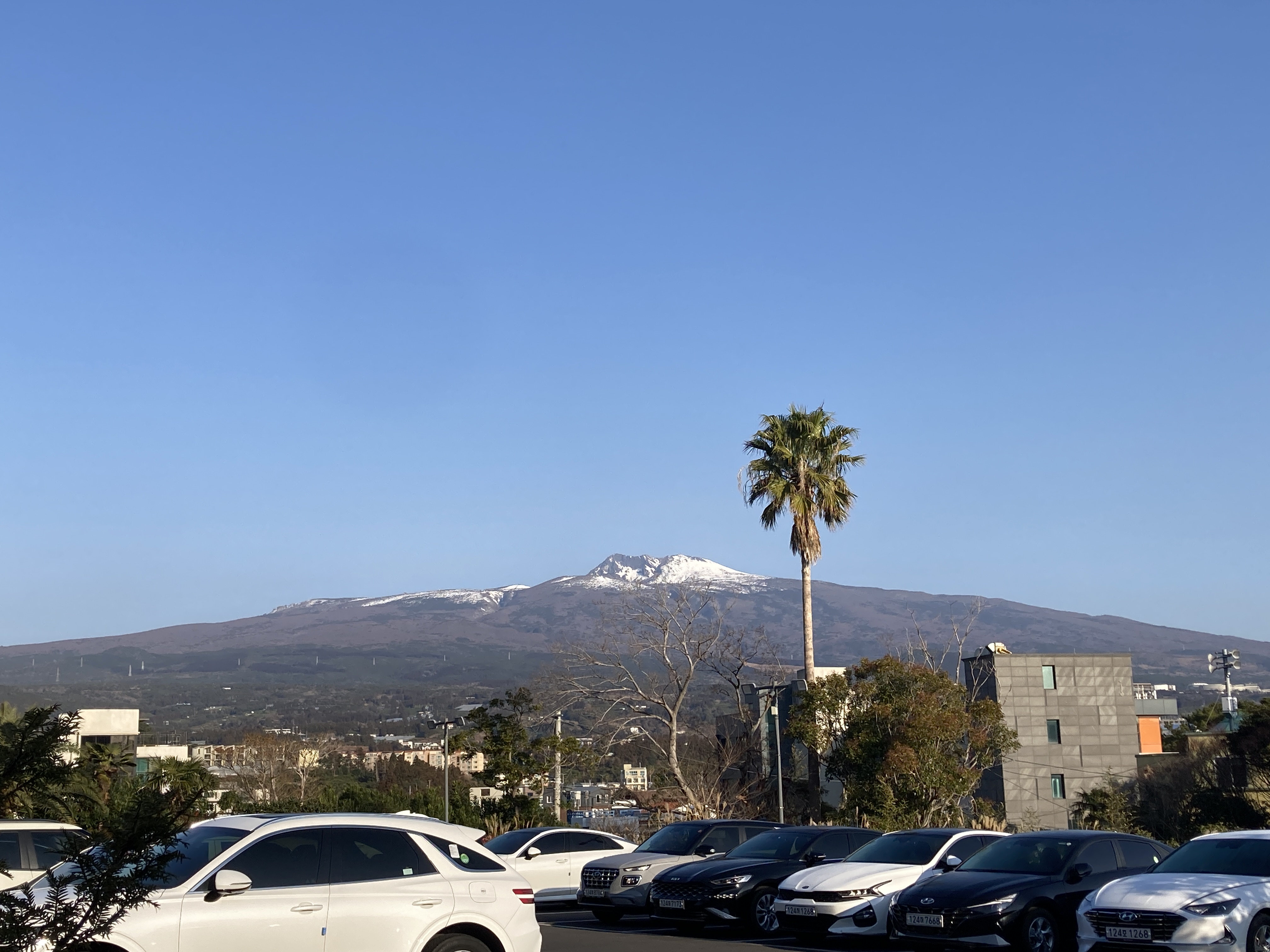 숙소를 나오니 주차장에서 멀리 한라산이 보여요.