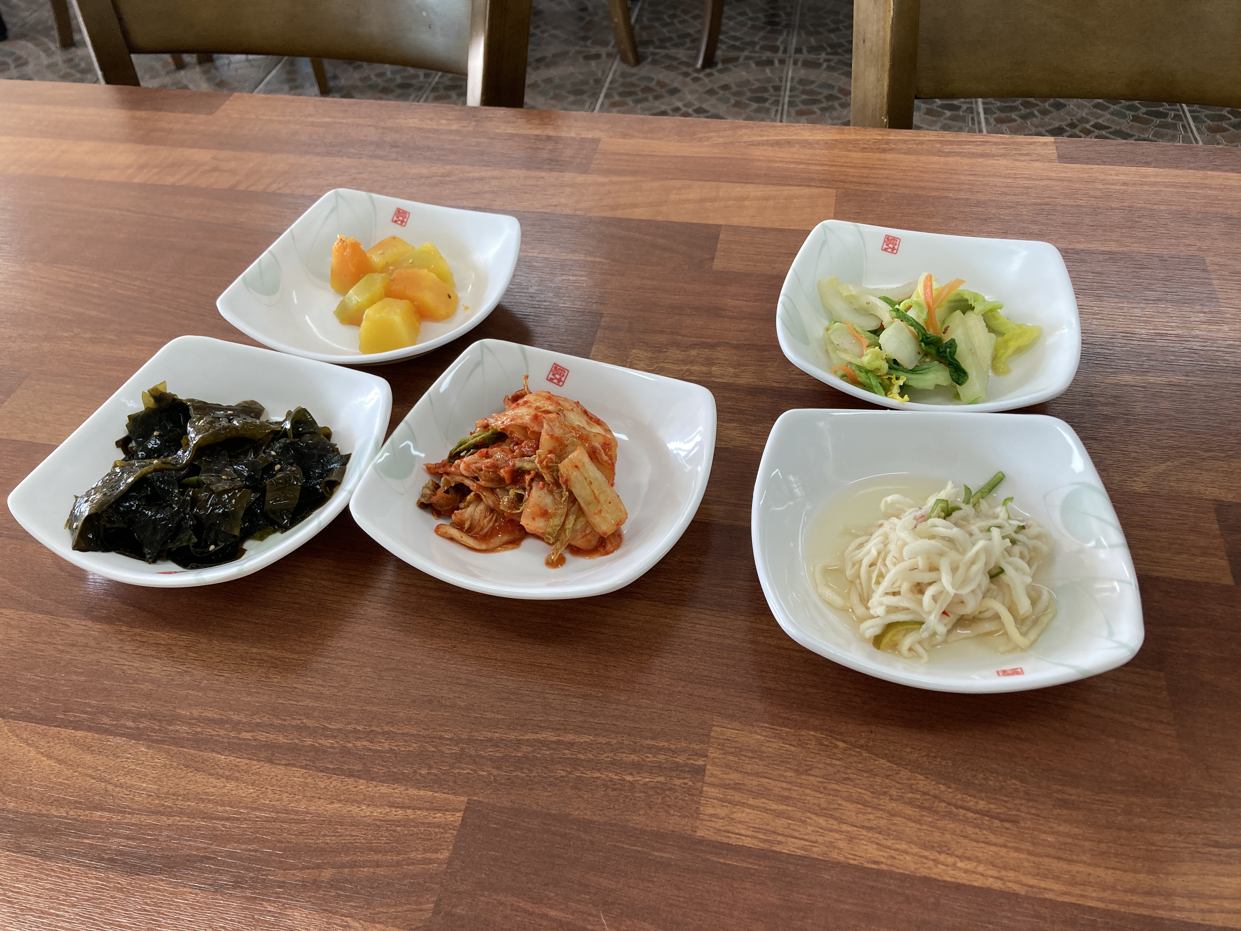 찬거리를 내어주셨어요. 늙은호박, 미역, 배추나물, 김치, 무말랭이 초무침이 나왔습니다.