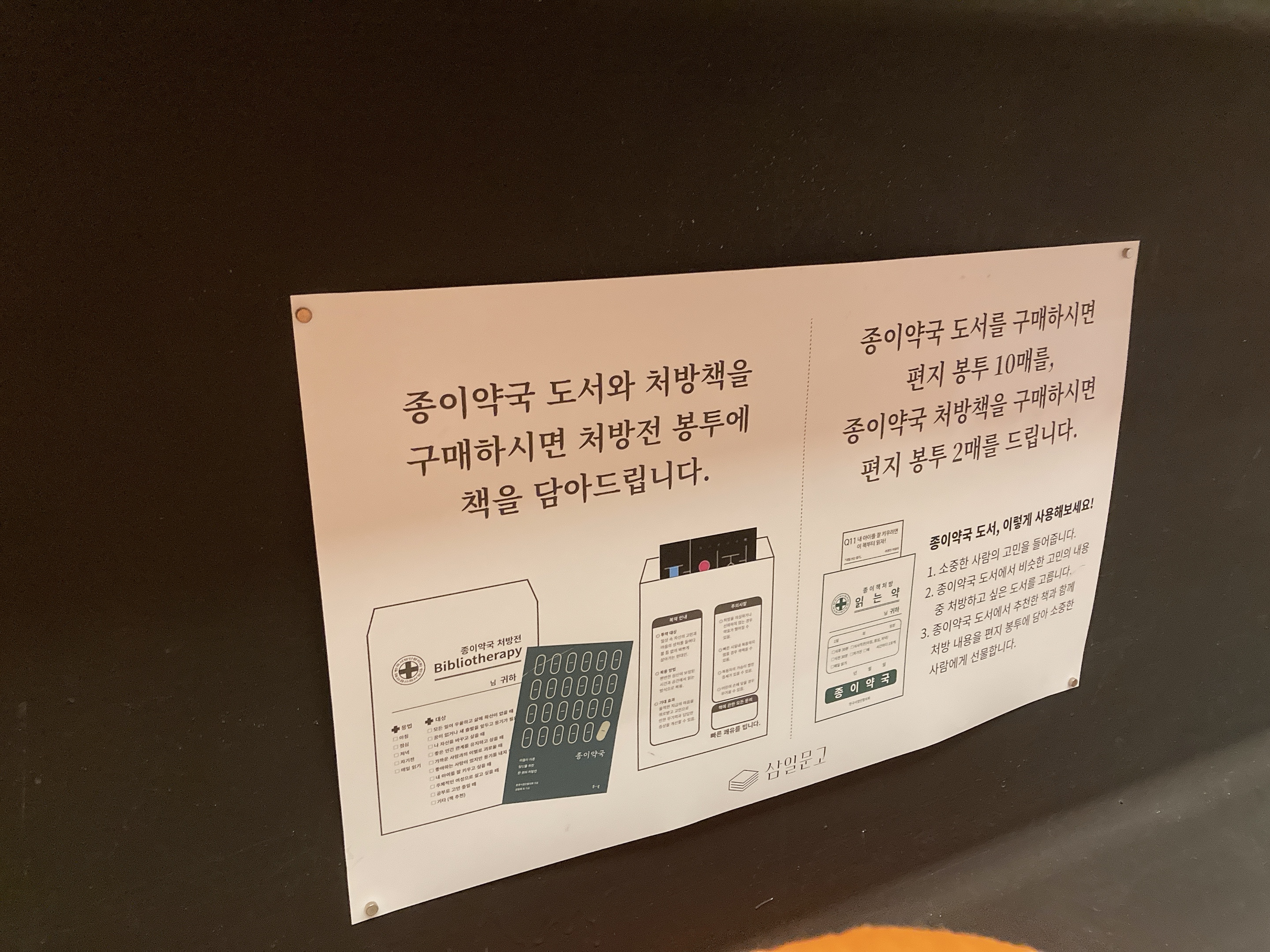 종이약국이라니, 마음에 복용하는 약이 되어주는 책이라는 생각이 참 좋았습니다. 종이약국은 삼일문고만의 콘텐츠는 아니더라고요. 주변에 있는 동네 책방을 통해서도 접할 수 있는 것 같습니다.