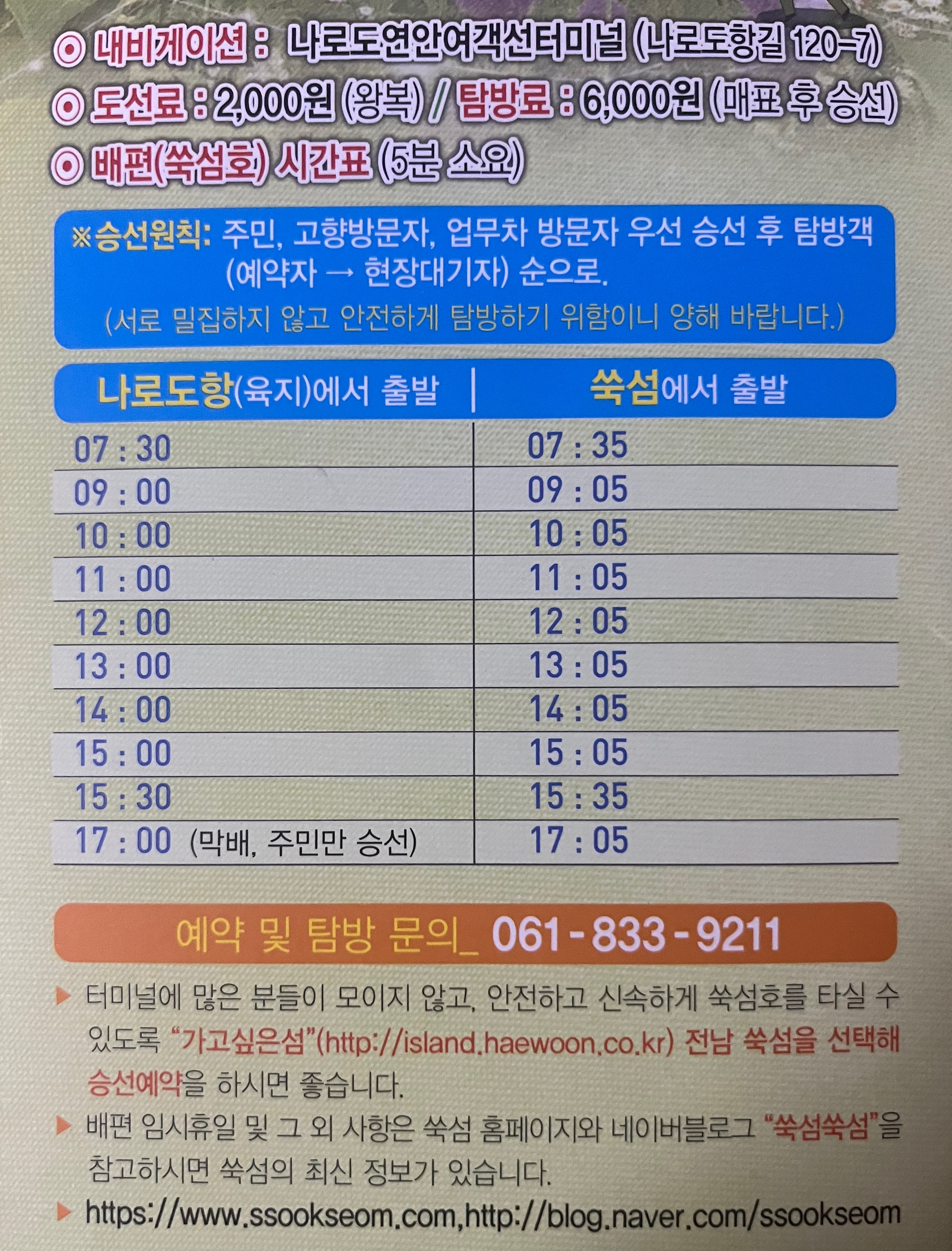 여객항에서 발권 가능하고, 정규 시간 외에도 인원이 충족되는 경우 배가 수시로 뜨는데, 탑승은 선착순으로 진행됩니다. 빠른 입도를 원한다면 미리 온라인예약을 해두는 것을 추천합니다.