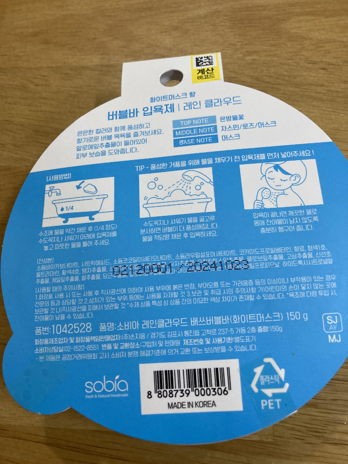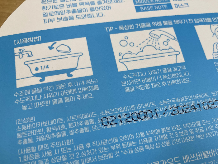 전신욕을 한다면 하나를 전체 다 사용하시는 걸 추천드립니다. 향은 개인차가 큰 편이겠지만 저는 생각보다 괜찮았고 사용감도 다른 종류도 구매해보고 싶은 수준의 만족감이었습니다.