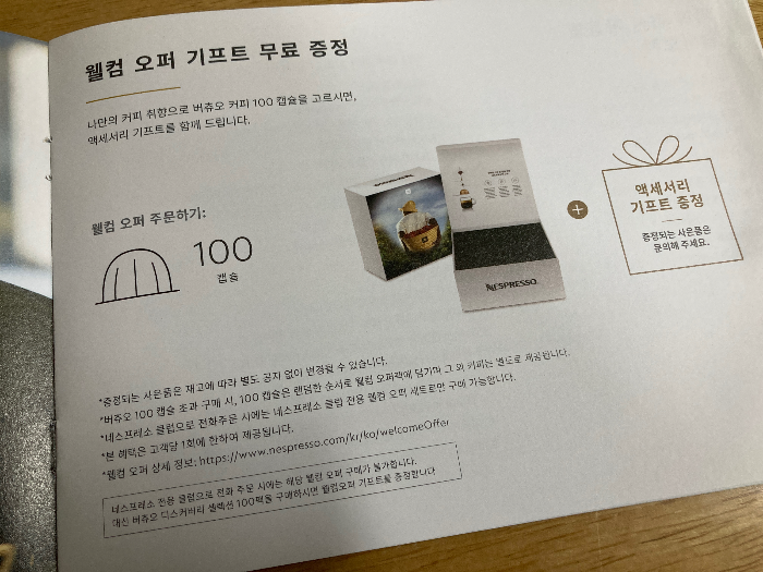 네스프레소에서는 버츄오 머신을 구매하고 등록, 캡슐 구매를 진행하면 웰컴 오퍼 기프트를 주는데