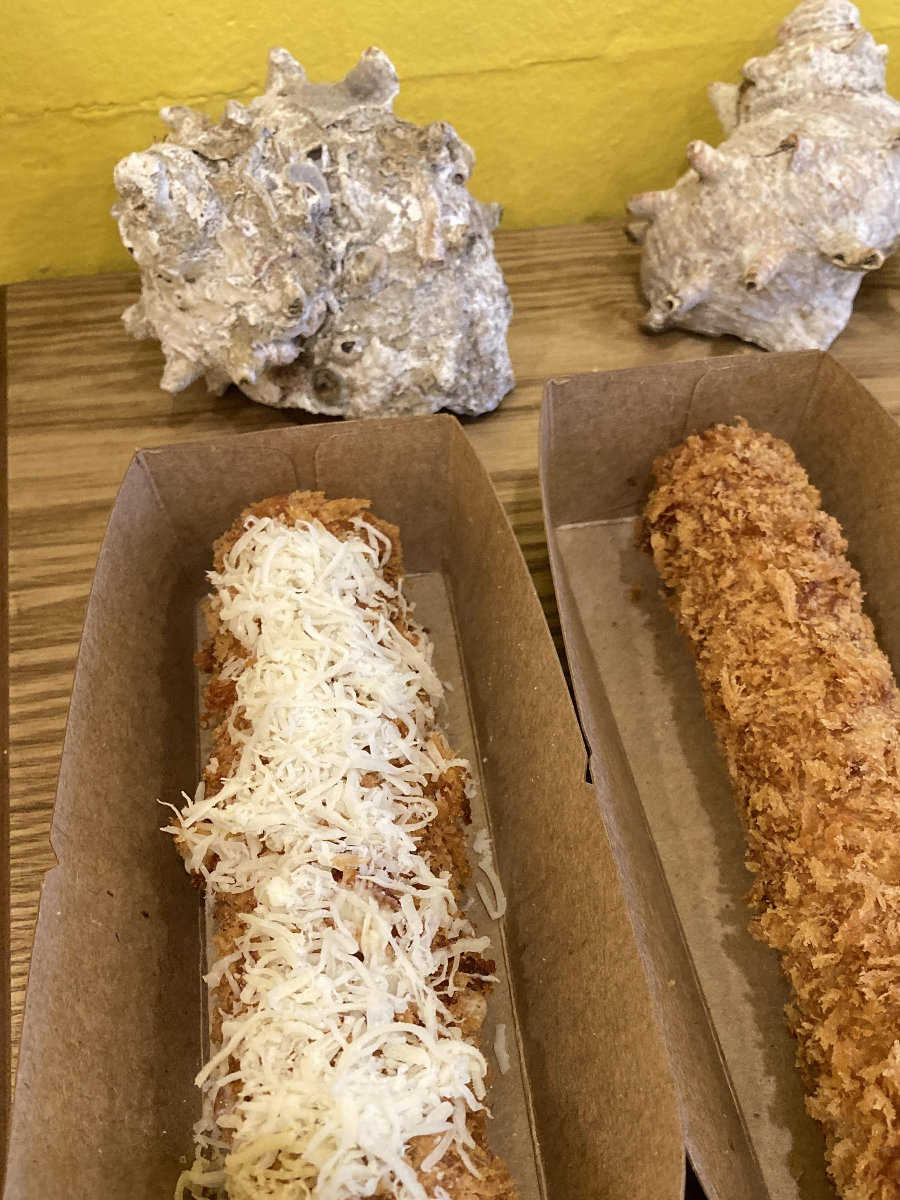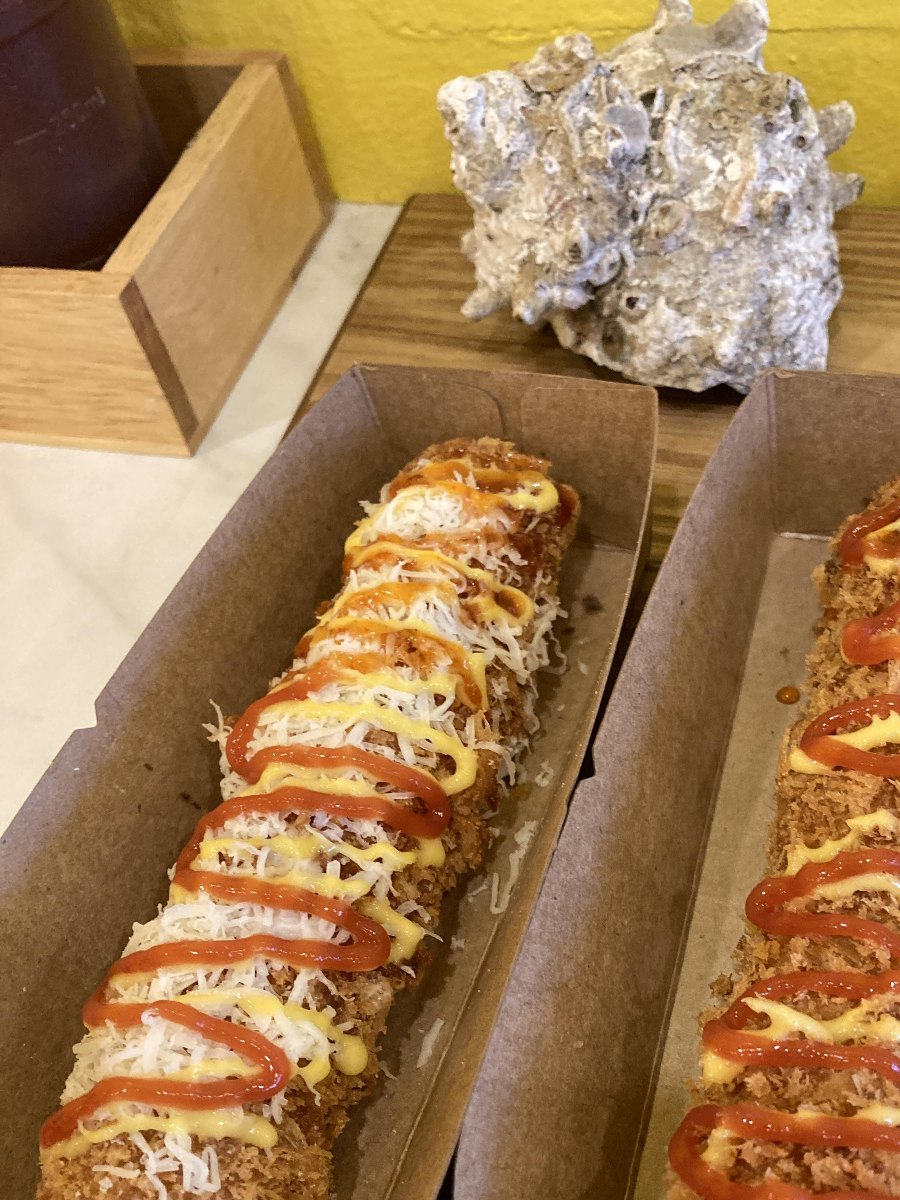 예상하셨다시피.. 치즈가 뿌려진 쪽이 치즈 핫도그입니다.