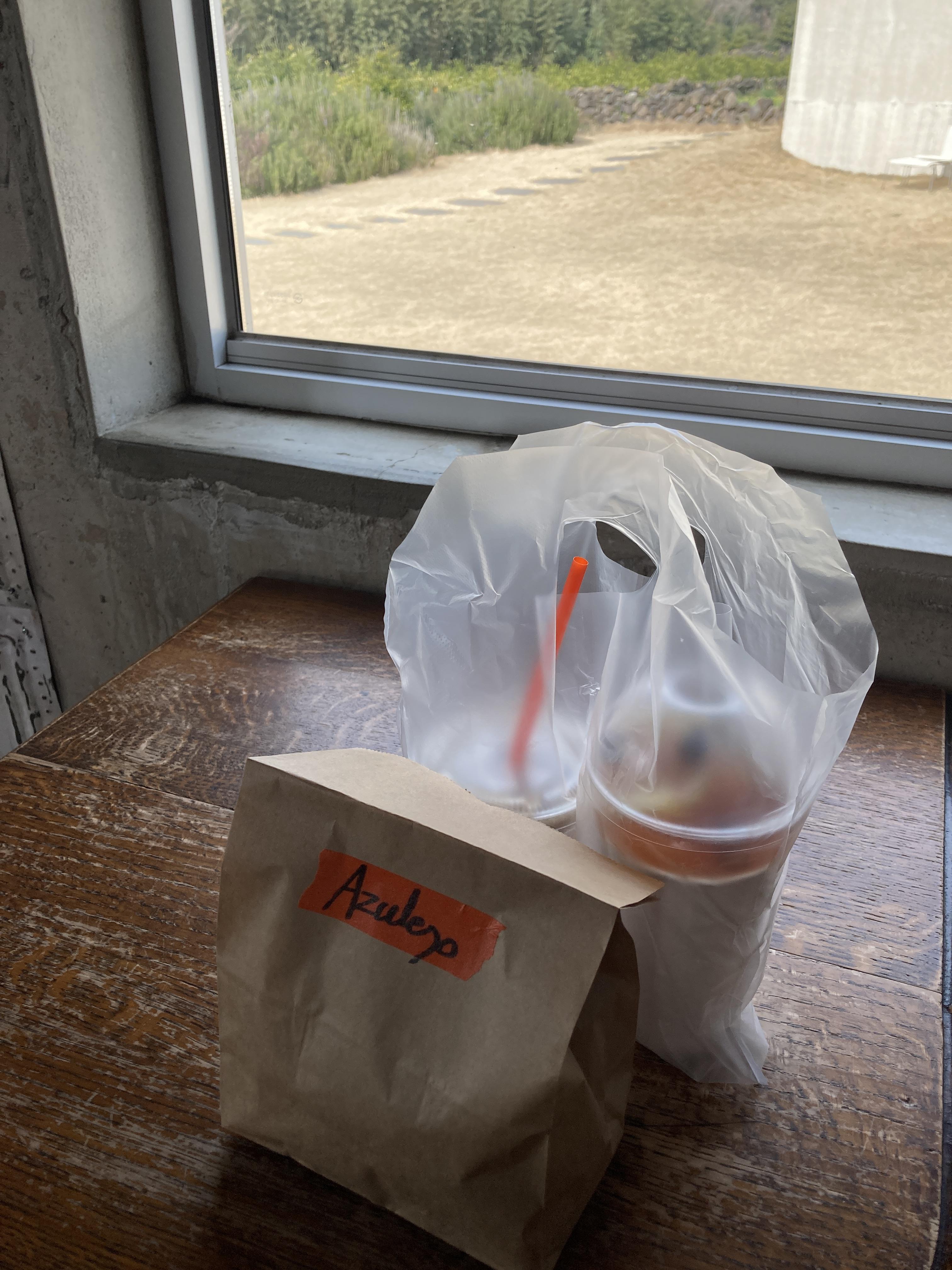 마스킹 테이프에 상호를 적어 봉투와 컵에 붙여주는게 재미있네요.