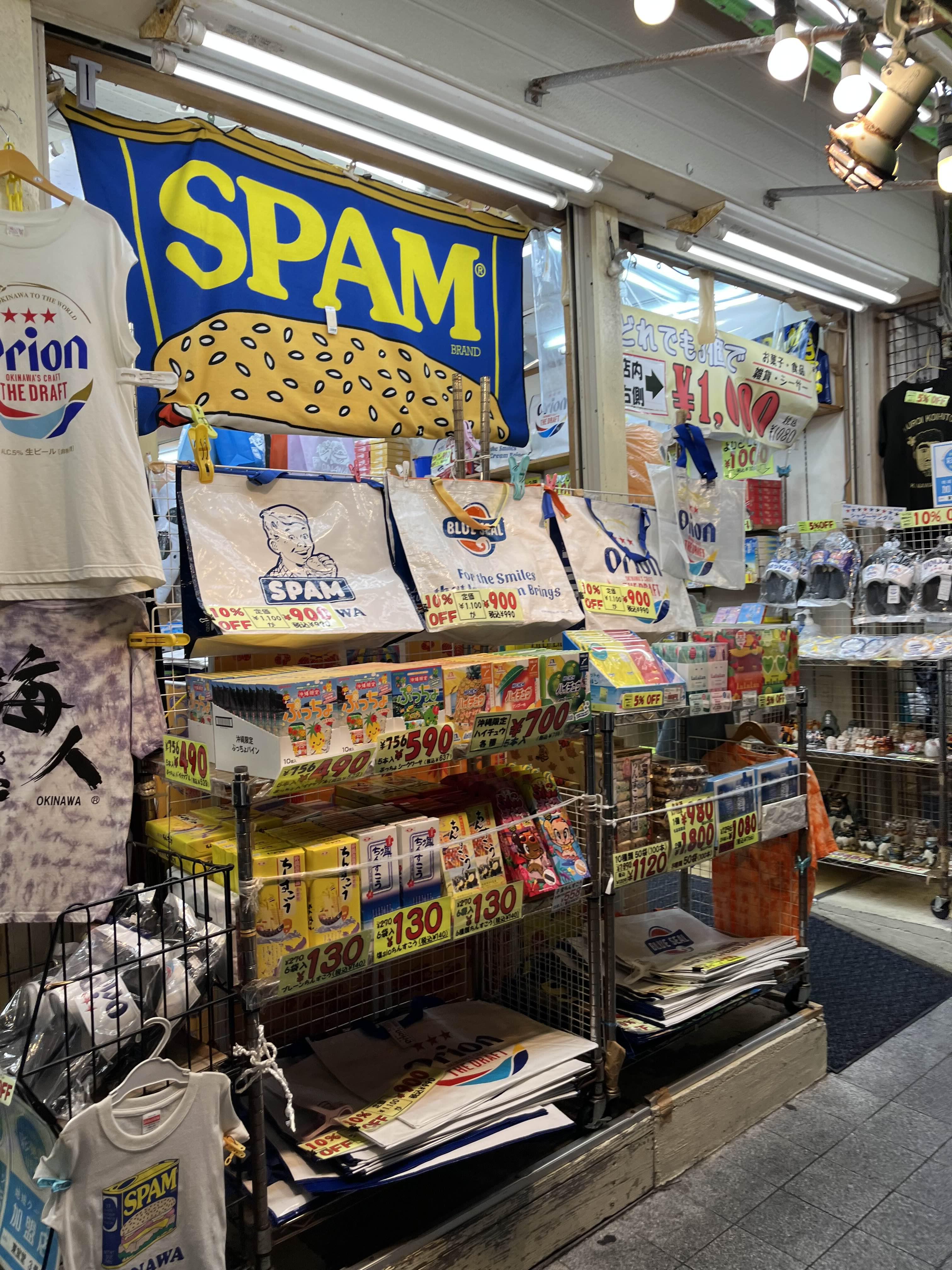 타월, 타포린 소재의 장바구니들도 많은데 저는 유난히 스팸디자인이 신기했어요. 나중에 알고 보니 스팸 생산 공장 중에 하나가 오키나와에 있다고 하더군요!