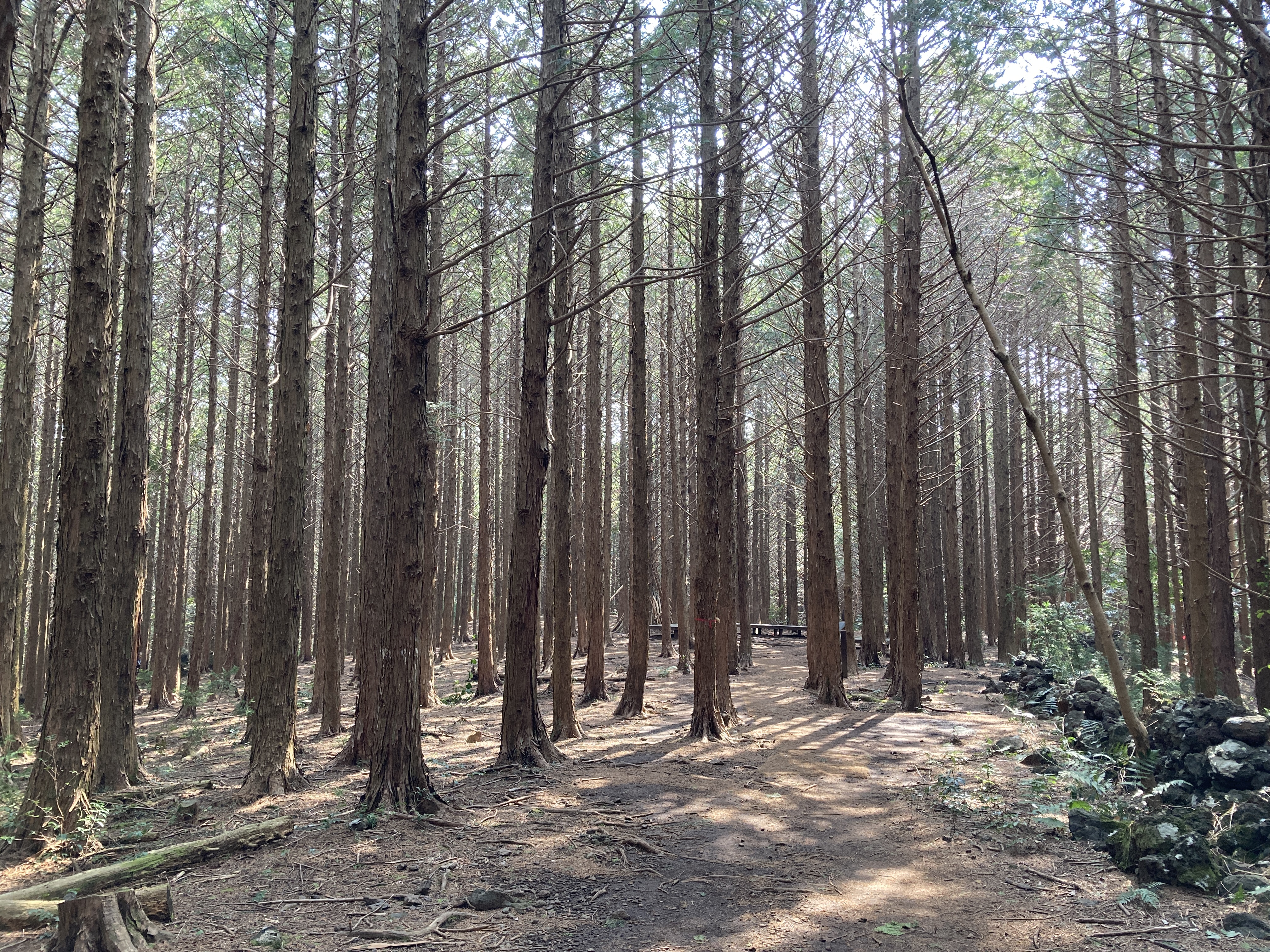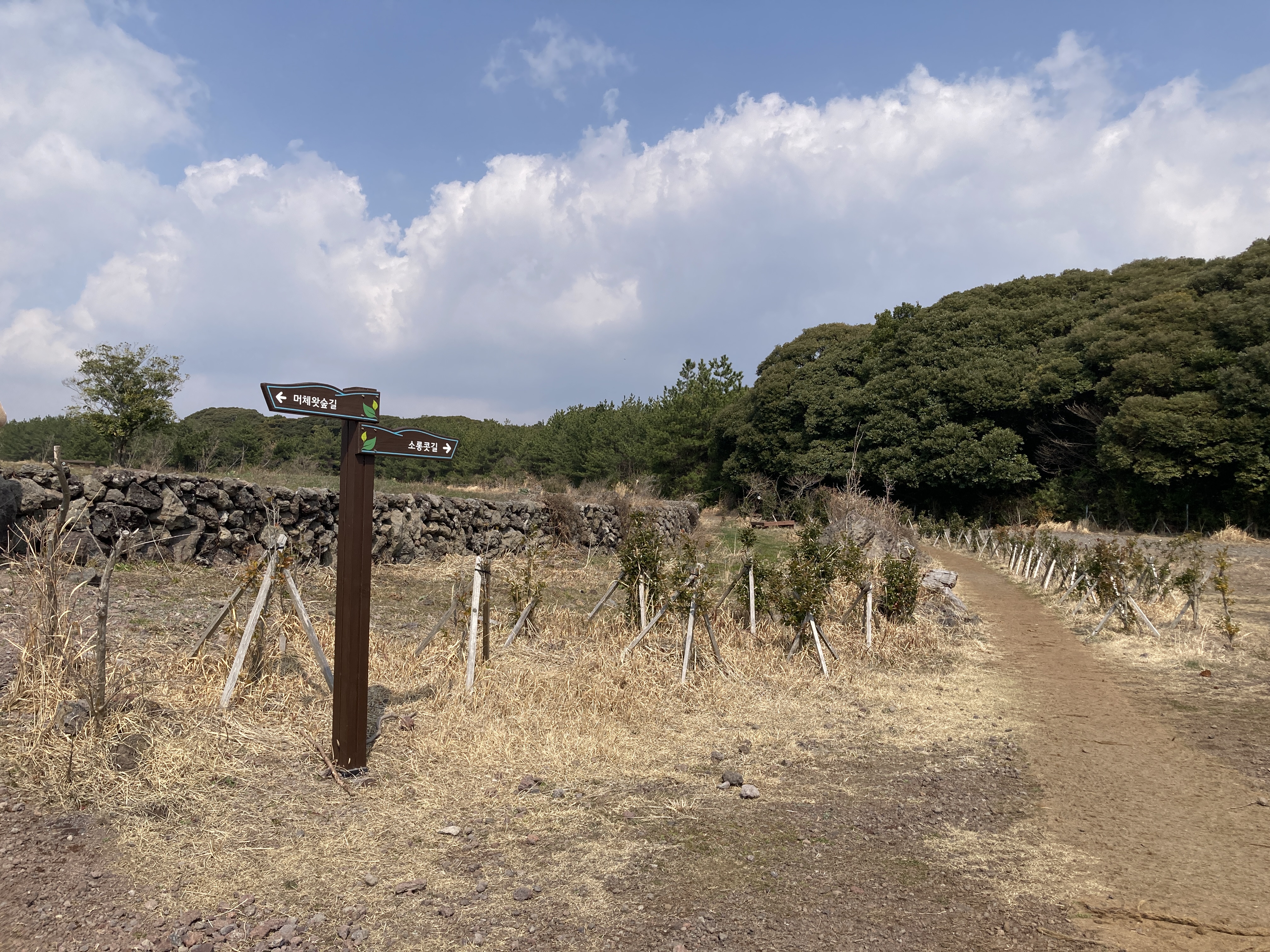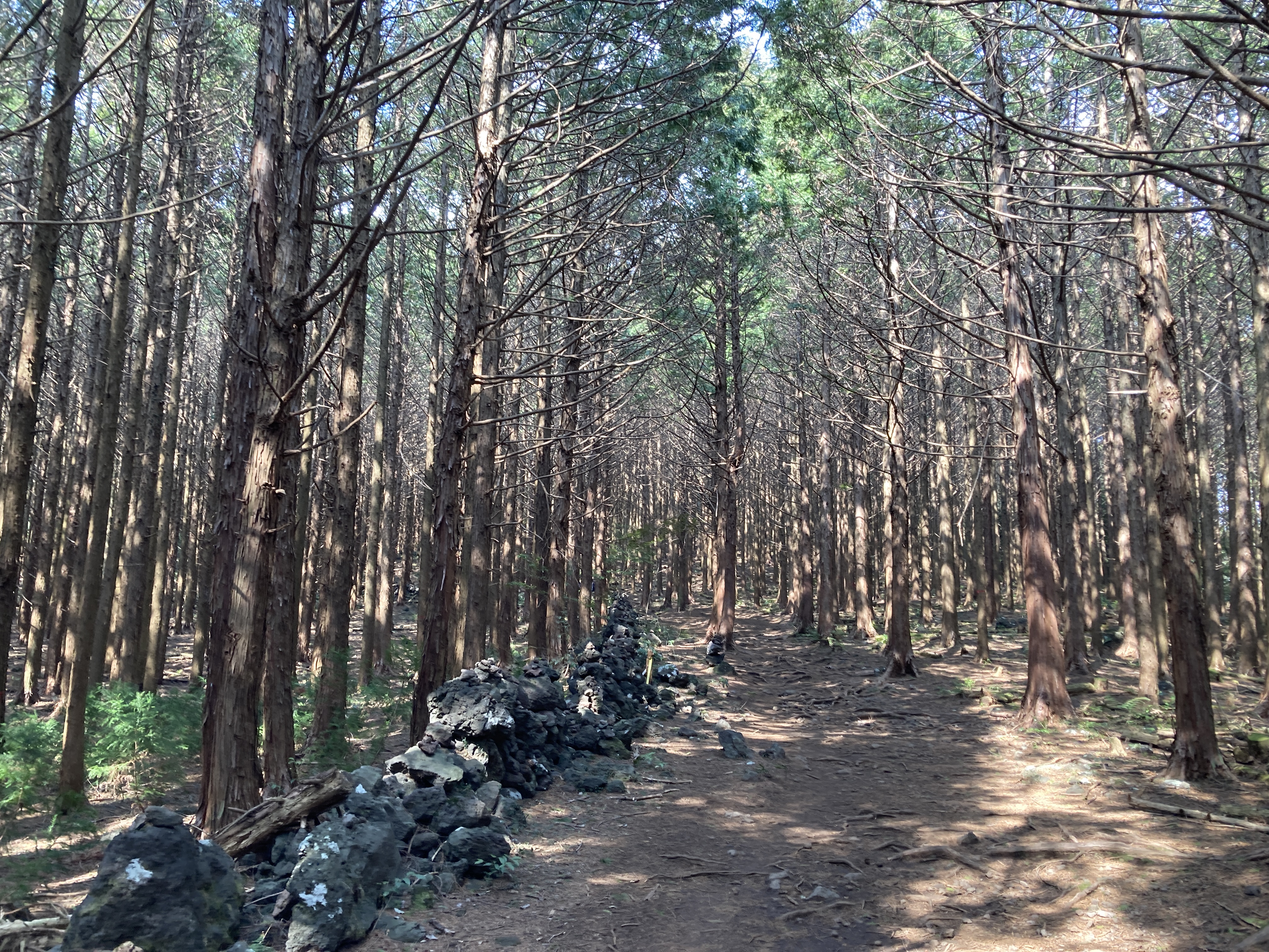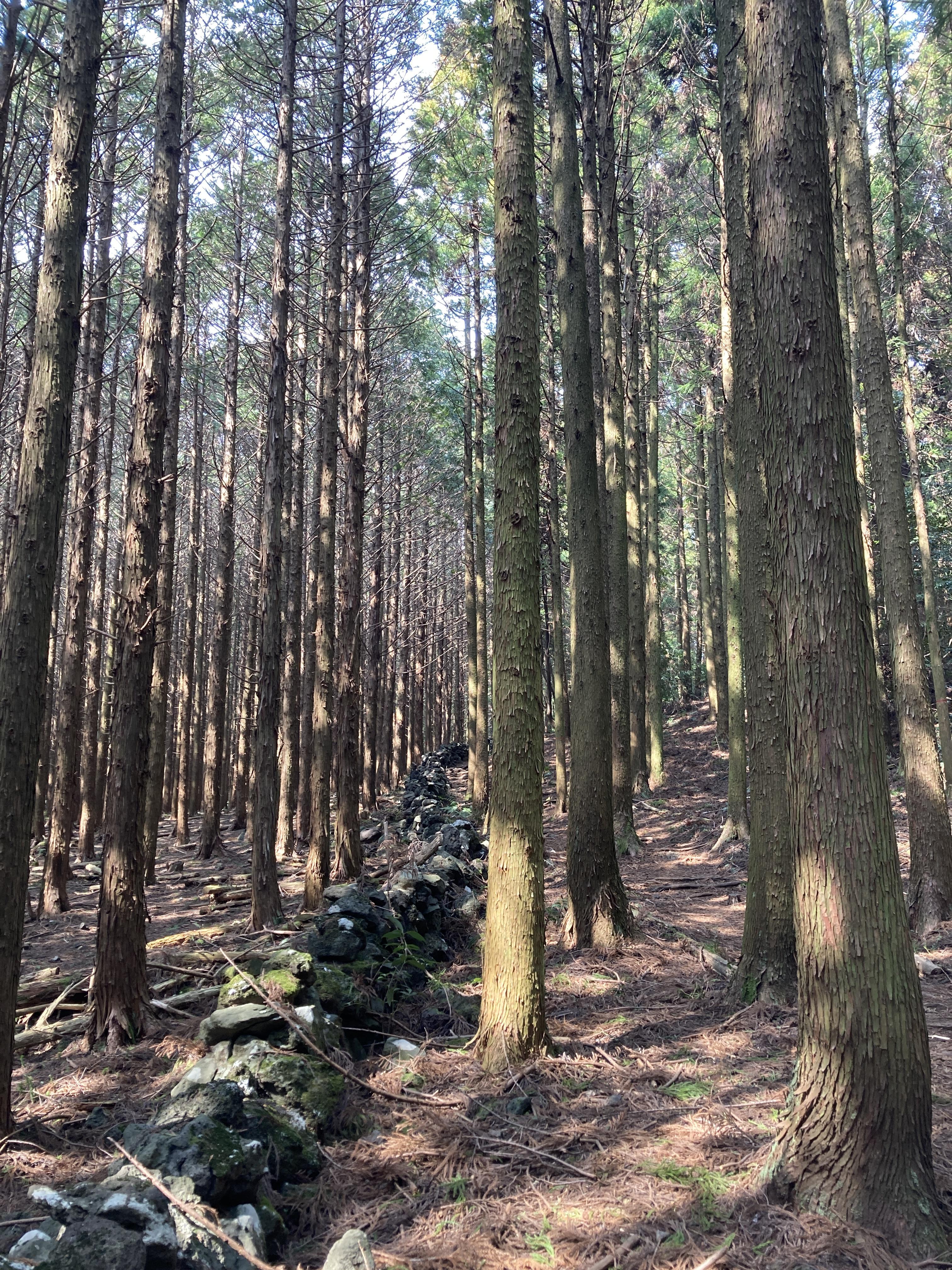 쭉쭉 뻗은 나무들이 끝 없이 이어진 잣성 돌담들과 함께 장관을 이루고 있습니다.