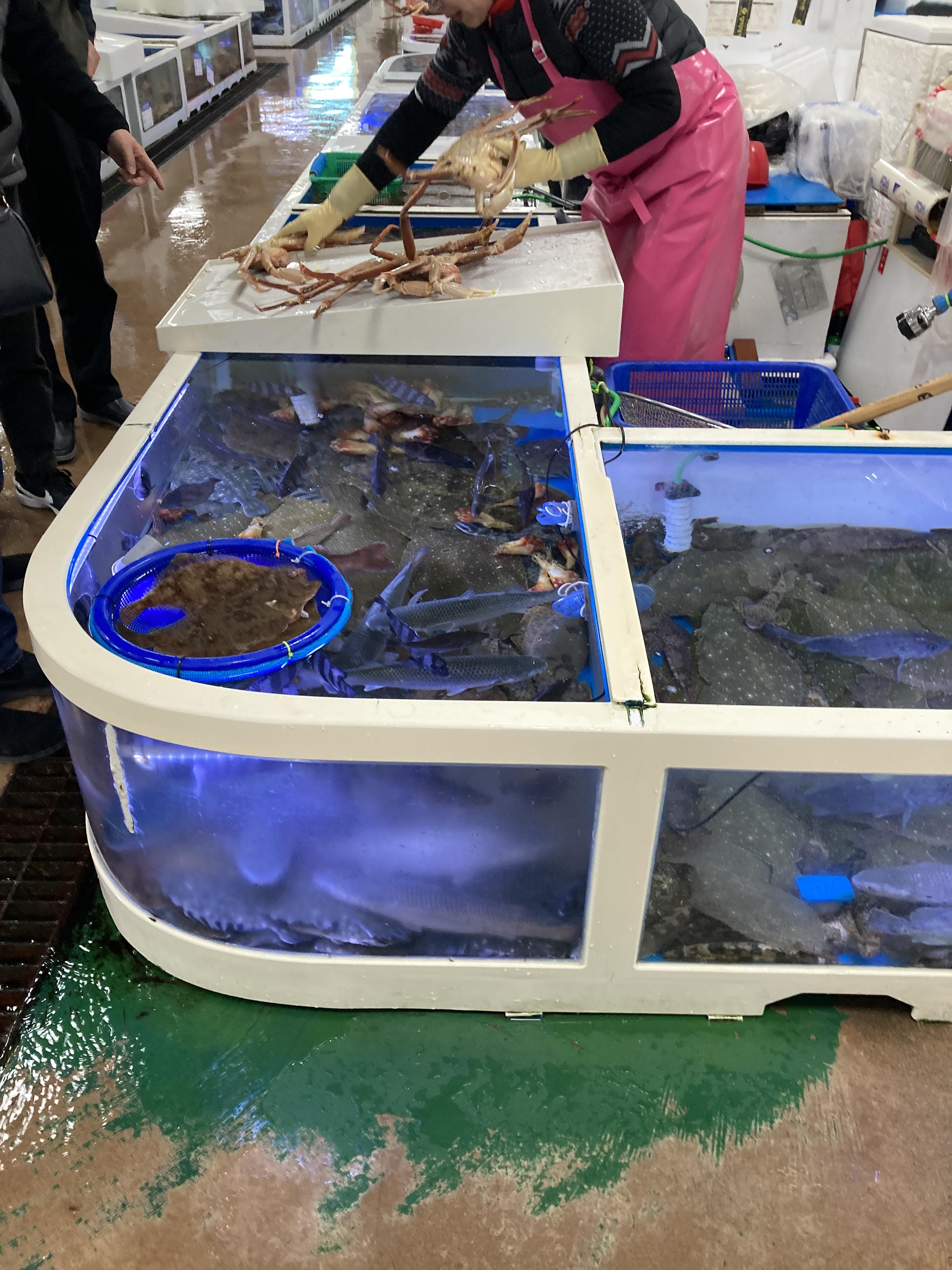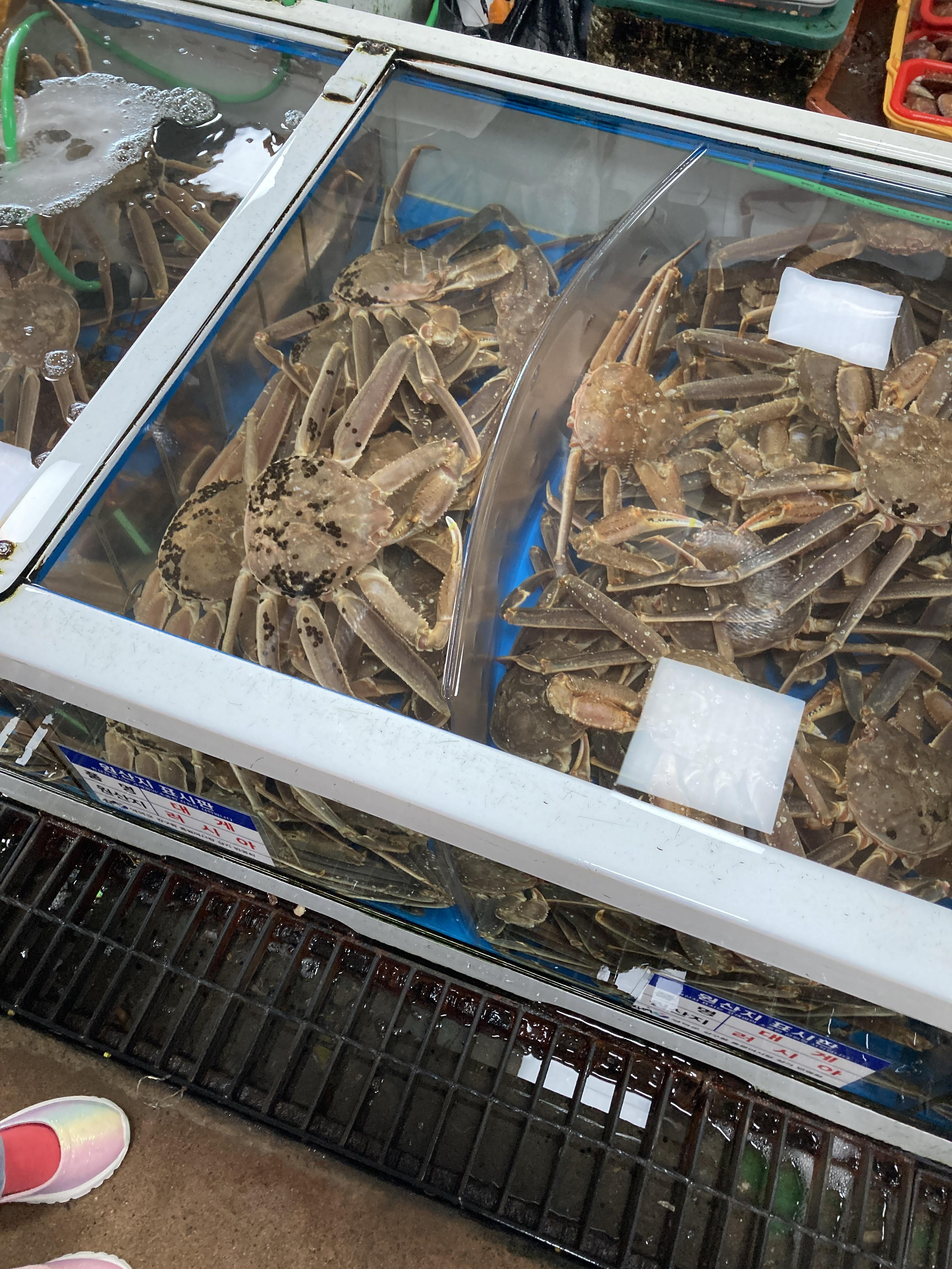 동광어시장 1층에 위치한 여러 판매자들을 쭉 돌아보고 가격도 한 번씩 물어보면서 괜찮아보이는 곳을 정해 대게를 구매했습니다. 대게 가격은 대충 비슷하고 서비스를 어떻게 얹어 주는 지에 따라 차이가 좀 있는 것 같습니다.