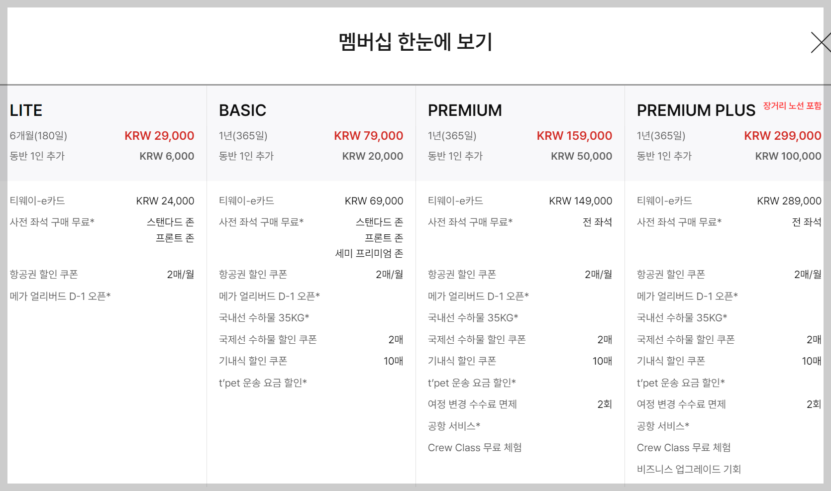 티웨이플러스 LITE 멤버쉽 기준 | 비구독 | 구독 |