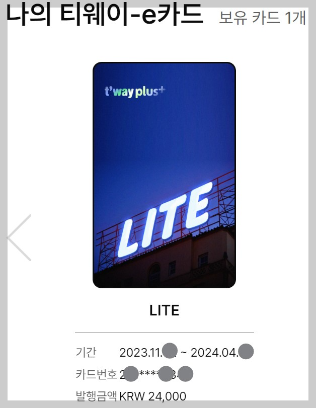 티웨이플러스는 구독료의 일부를 E카드로 환급해 주는데, 라이트의 경우 24000원이 지급돼요. (참고로 이 혜택은 동반 혜택자에게는 해당되지 않고, 가입한 본인에게만 지급됩니다. )